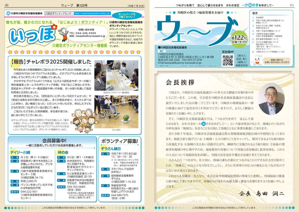 「令和7年度川崎区社協福祉まつり開催について」、「年末たすけあい運動「支援金」申請のお知らせ」、「令和7年度共同募金について」、「令和6年度事業報告・決算報告」、「民生委員児童委員について」、「子どもの食糧支援について」、「川崎区ボランティア情報誌「いっぽ」」
