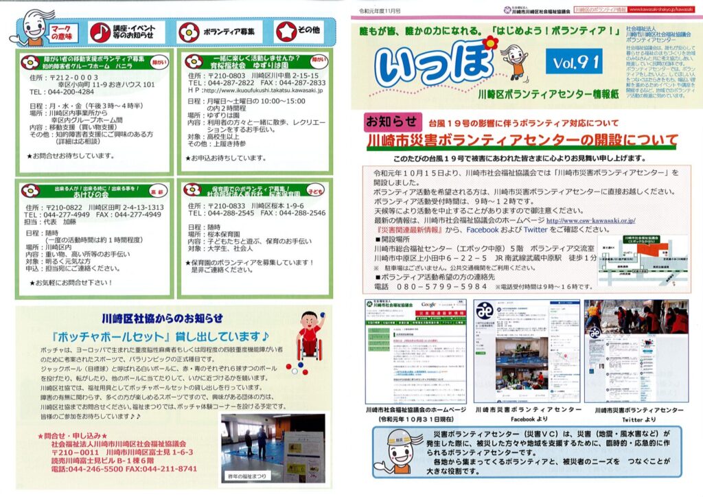 台風19号の影響に伴う川崎市災害ボランティアセンター開設のお知らせ、『ボッチャボールセット』貸し出しのお知らせなどが掲載されています。是非、ご覧ください!!