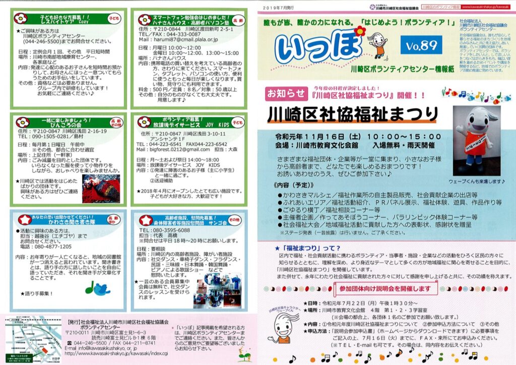 令和元年度『川崎区社協福祉まつり』開催のお知らせ、福祉まつりイベントボランティア・一芸ボランティアの募集案内、手作り工房ウィンドウによる夏休み期間の染色チャレンジのお知らせなどが掲載されています。是非、ご覧ください!!